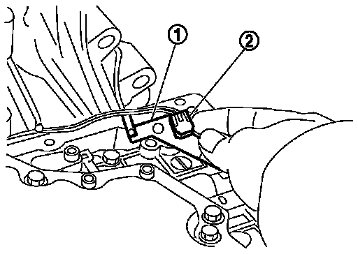 64. Install A/T fluid temperature sensor 2 (1) [with bracket (2)] to control valve with TCM. Tighten A/T fluid temperature sensor 2 bolt to the specified torque.