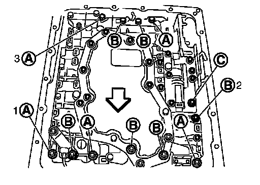 66. Install bolts (A), (B) and (C) in control valve with TCM. Tighten bolt 1, 2 and 3 temporarily to prevent dislocation. After that tighten them in order (1 to 2 to 3), and then tighten other bolts.