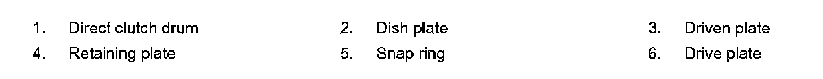 Install drive plates, driven plates, dish plate, retaining plates and snap ring to direct clutch drum.