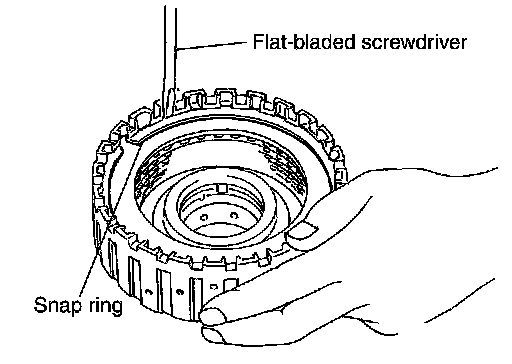 Install snap ring to direct clutch drum with a flat-bladed screwdriver.