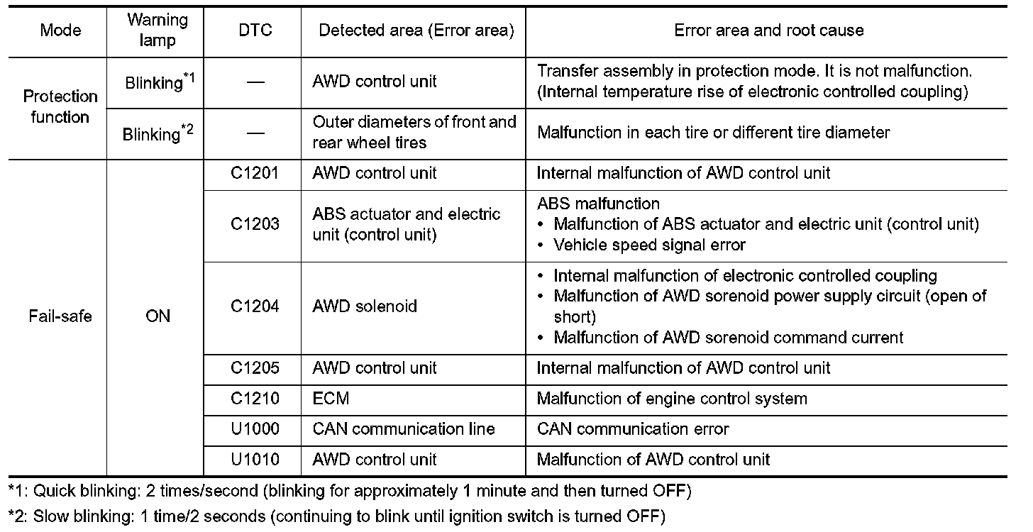 - If any malfunction occurs in AWD electrical system, and control unit detects the malfunction, AWD warning lamp on combination meter turns ON to indicate system malfunction.