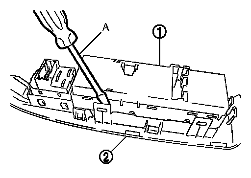 2. Power window main switch (1) is removed from power window main switch finisher (2) using flat-head screw driver (A) etc.