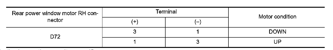 3. Check motor operation by connecting the battery voltage directly to rear power window motor RH terminals.
