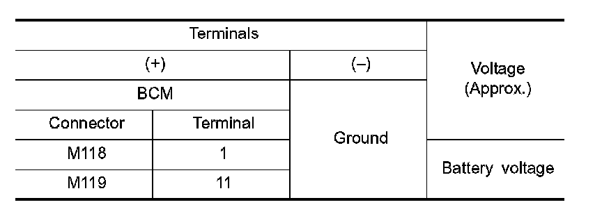 3. Check voltage between BCM harness connector and ground.