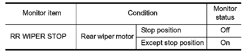 3. Check that "RR WIPER STOP" changes to "ON" and "OFF" linked with the wiper operation.