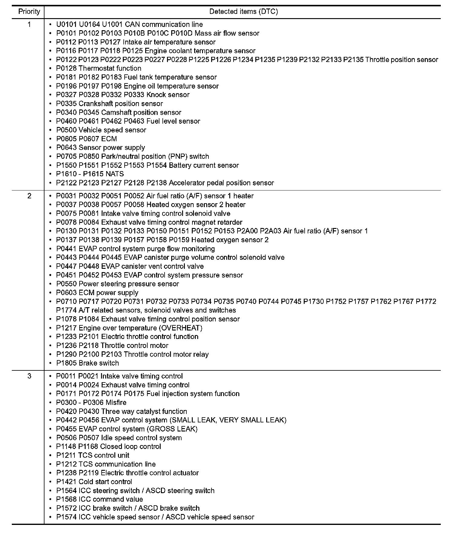 If some DTCs are displayed at the same time, perform inspections one by one based on the following priority chart.