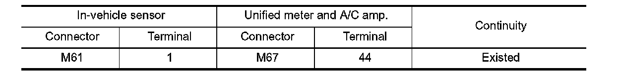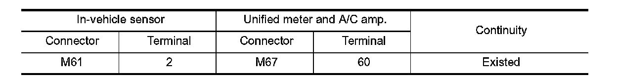 3. Check continuity between in-vehicle sensor harness connector and unified meter and A/C amp. harness connector.
