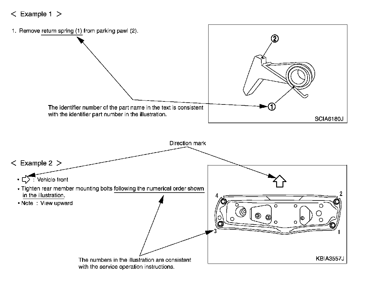 The following sample explains the relationship between the part description in an illustration, the part name in the text and the service procedures.