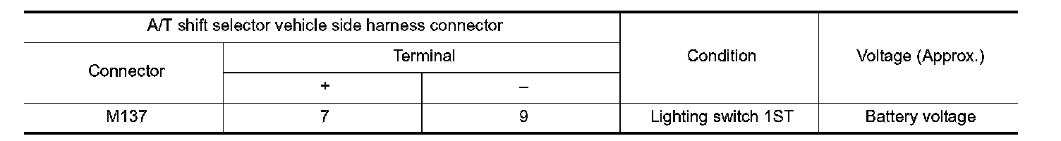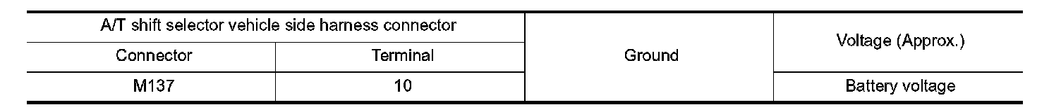 4. Check voltage between A/T shift selector vehicle side harness connector terminals.