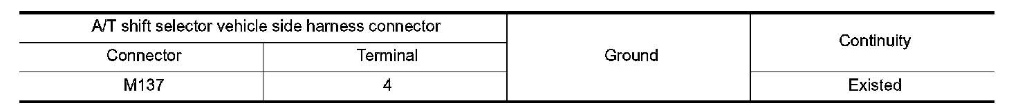 Check continuity between A/T shift selector vehicle side harness connector terminal and ground.