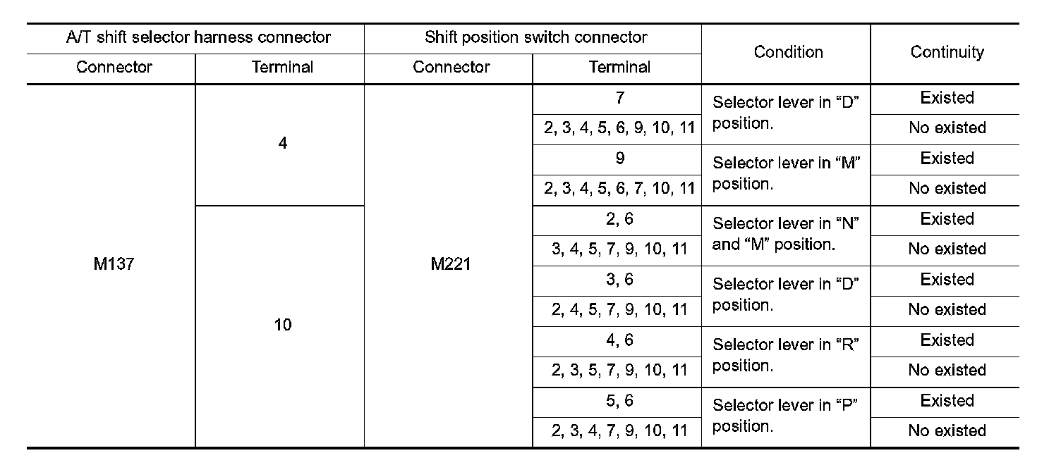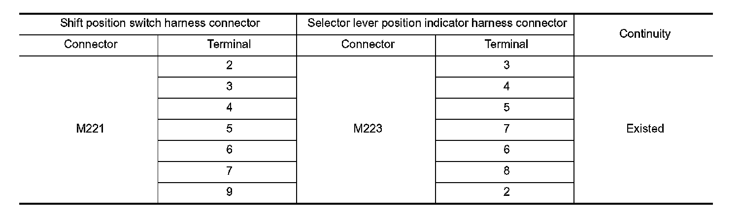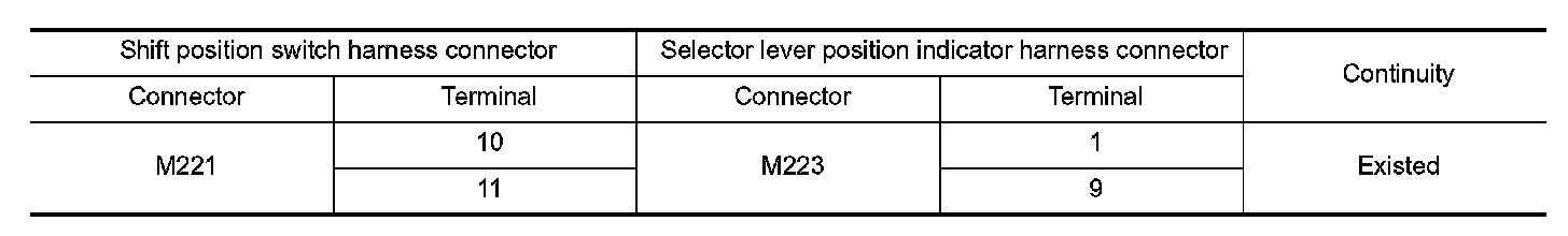 2. Check continuity between shift position switch harness connector terminals and selector lever position indicator connector terminals.