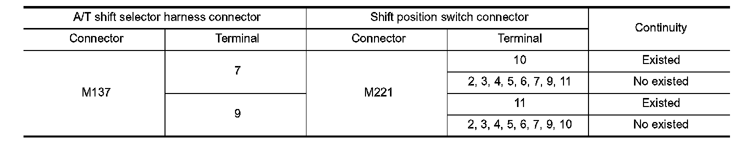 2. Check continuity between A/T shift selector harness connector terminals and shift position switch connector terminals.