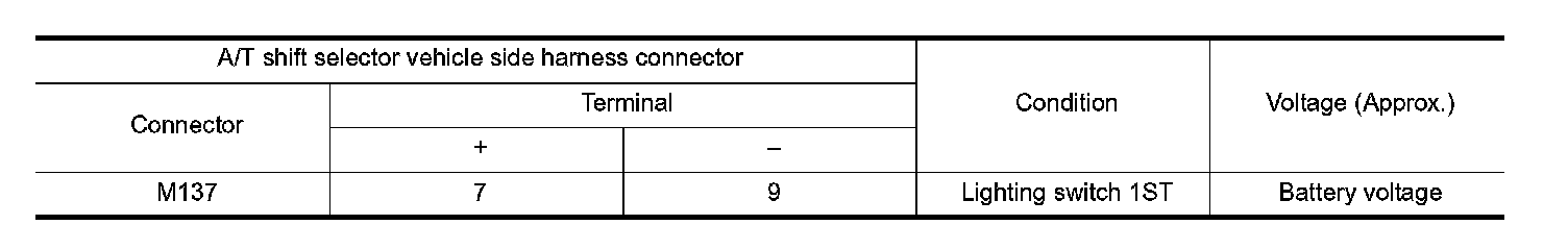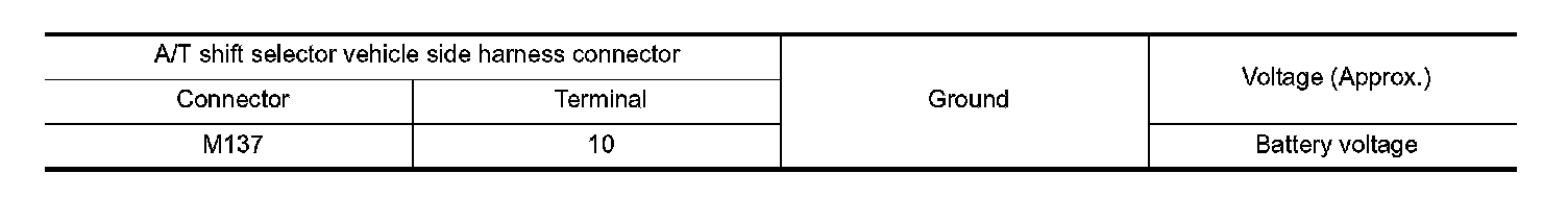 4. Check voltage between A/T shift selector vehicle side harness connector terminals.