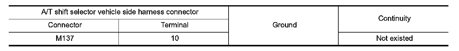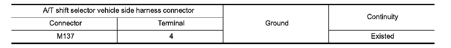 Check continuity between A/T shift selector vehicle side harness connector terminal and ground.