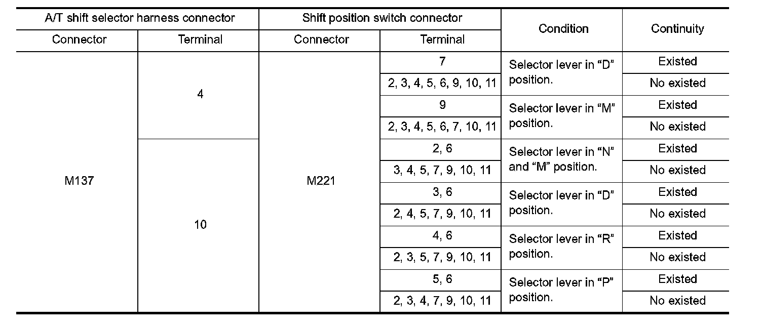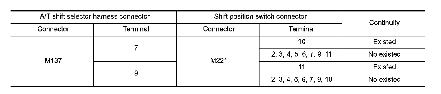 2. Check continuity between A/T shift selector harness connector terminals and shift position switch connector terminals.