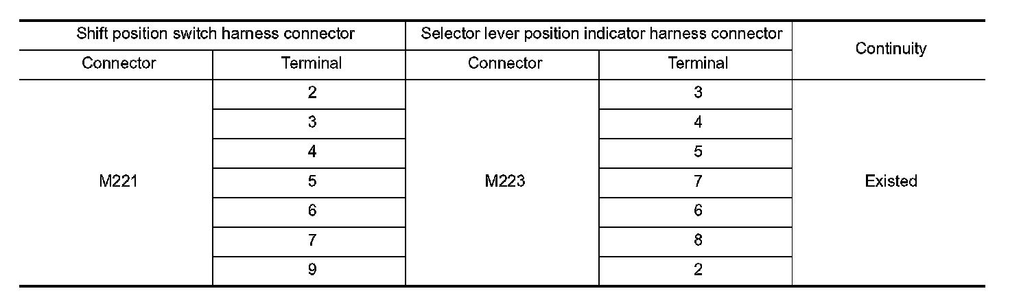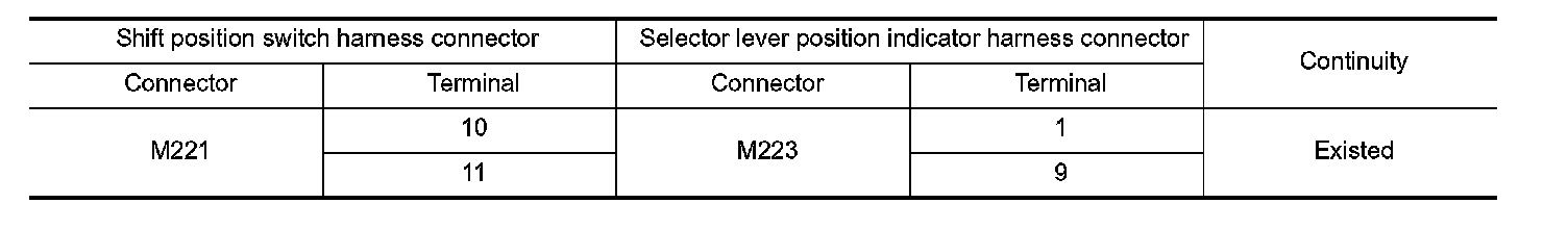 2. Check continuity between shift position switch harness connector terminals and selector lever position indicator connector terminals.