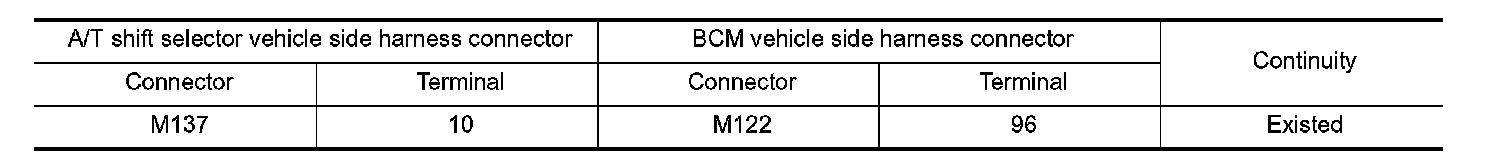 3. Check continuity between A/T shift selector vehicle side harness connector terminal and BCM vehicle side harness connector terminal.