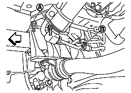 12. Remove power steering oil pump hose bracket bolts (A) and clamp bolts (B).