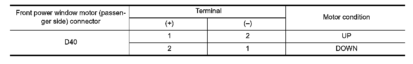 3. Check motor operation by connecting the battery voltage directly to front power window motor (passenger side) connector.