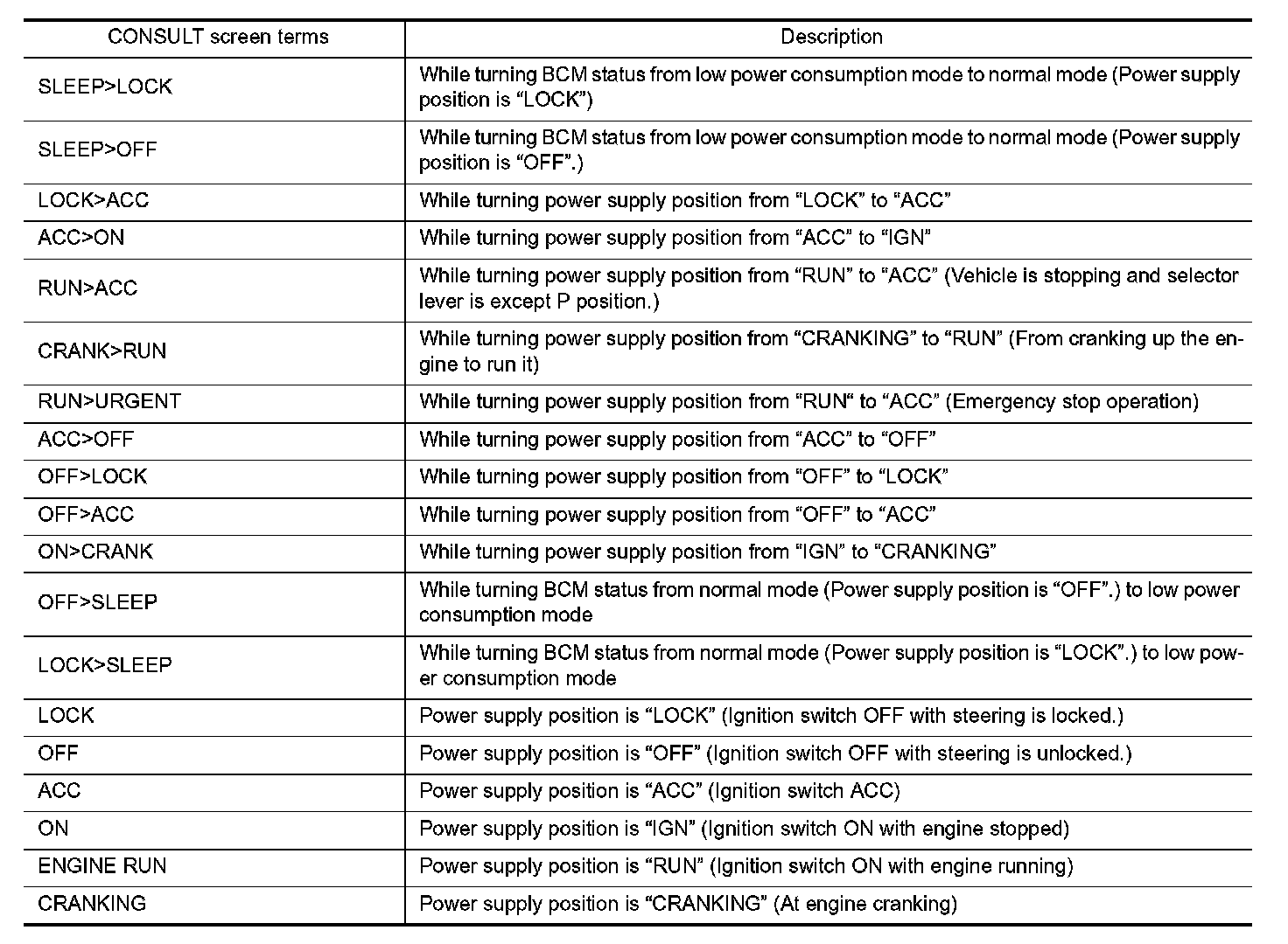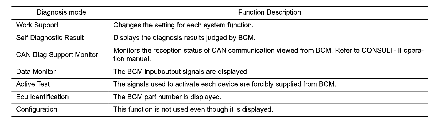 CONSULT-III performs the following functions via CAN communication with BCM.