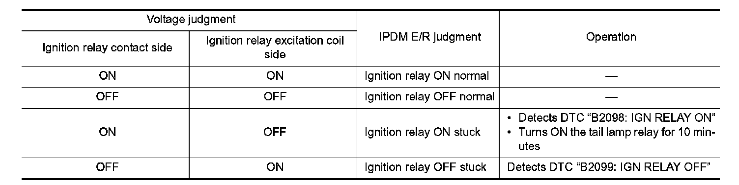 - IPDM E/R judges the ignition relay error if the voltage differs between the contact circuit and the excitation coil circuit.