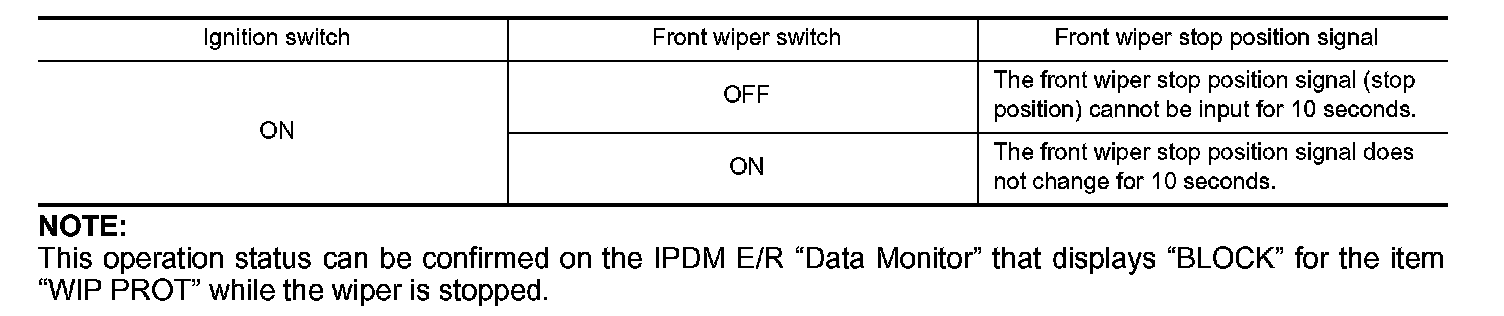When a front wiper stop position signal is in the conditions listed below, IPDM E/R stops power supply to wiper after repeating a front wiper 10 seconds activation and 20 seconds stop five times.