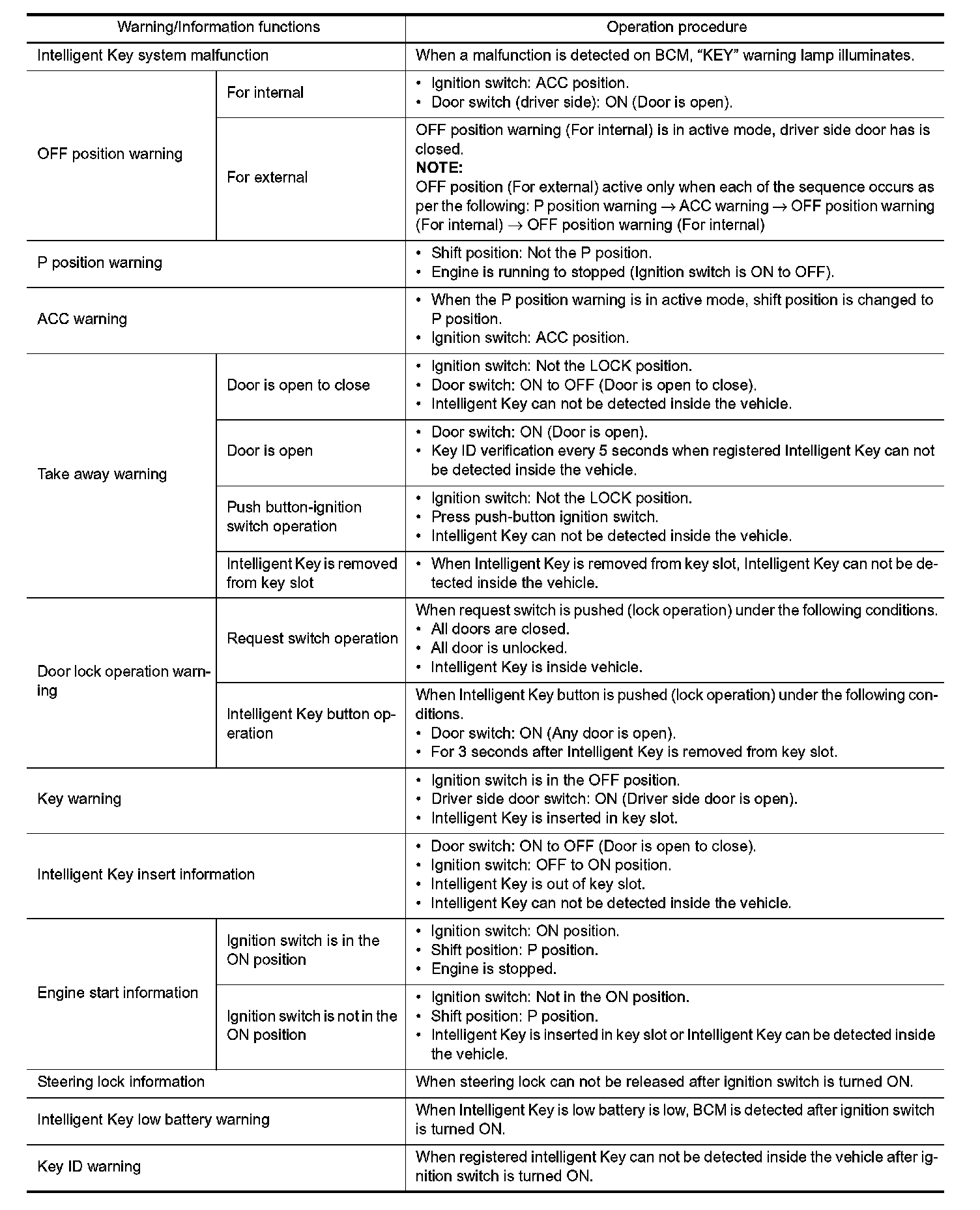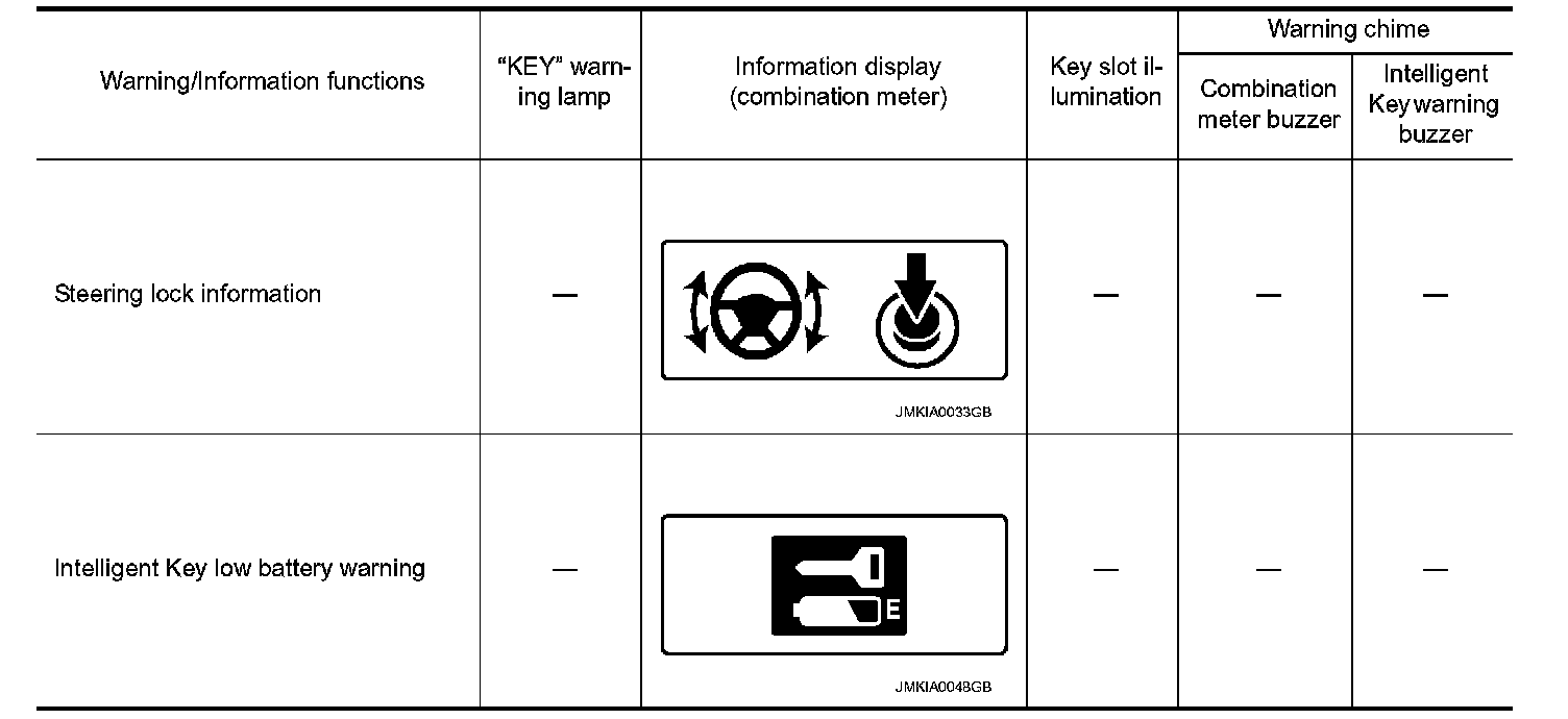 The warning functions are as per the following and are given to the user as warning information and warnings using combinations of Intelligent Key warning buzzer, KEY warning lamp, key slot illumination and information displayed on combination meter.