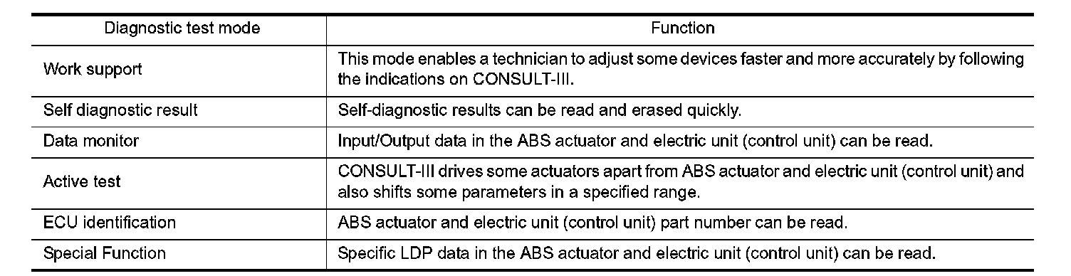 CONSULT-III can display each diagnostic item using the diagnostic test modes shown following.