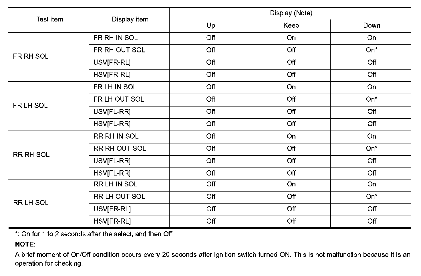 - Select "Up", "Keep" and "Down" of "ACTIVE TEST" in "ABS" with CONSULT-III. Then use screen monitor to check that solenoid valve operates as shown in the table below.