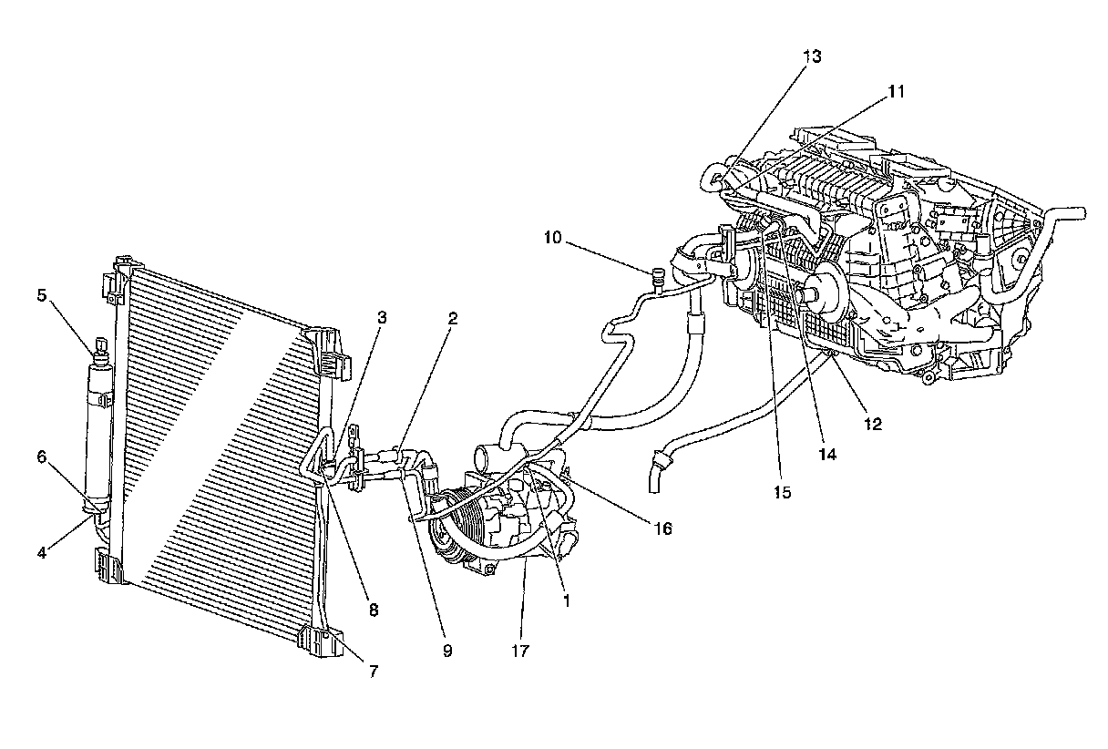 4. Perform the leakage test in the numerical as shown in the figure. [high-pressure side (compressor discharge "1" to evaporator inlet "11") to low-pressure side (evaporator drain hose "12" to shaft seal "17")]