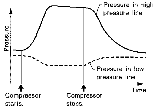 The pressure on the high-pressure side drops gradually after refrigerant circulation stops and pressure on the low-pressure side rises gradually, as shown in the graph. Some leakages are more easily detected when pressure is high.