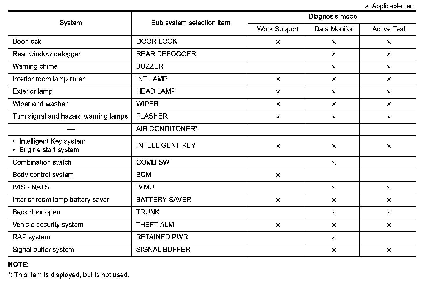 It can perform the diagnosis modes except the following for all sub system selection items.