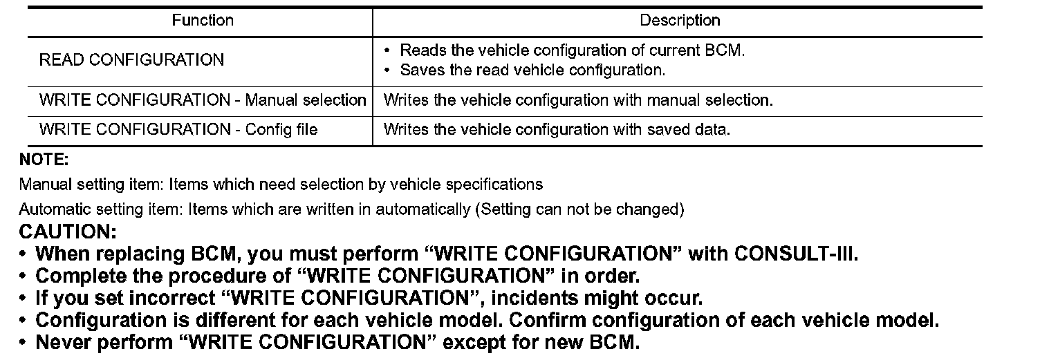 - When replacing BCM, you must perform "WRITE CONFIGURATION" with CONSULT-III.