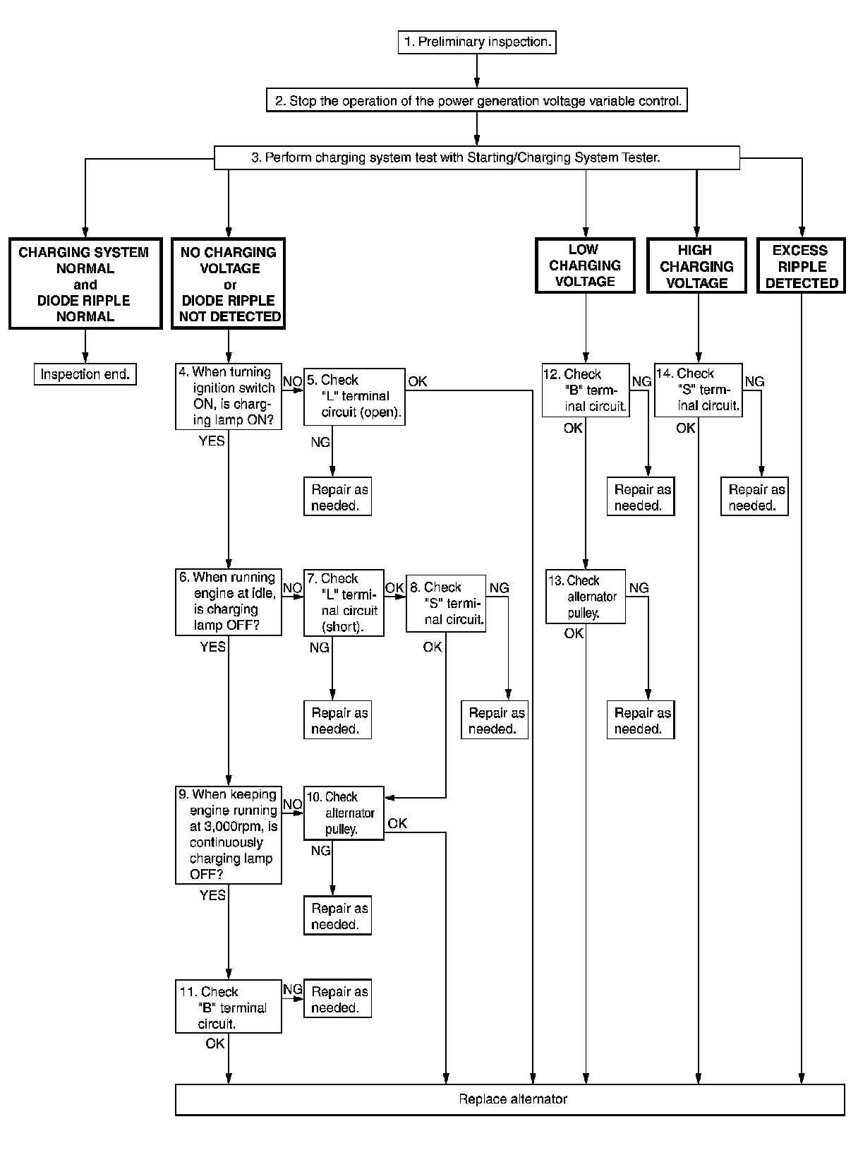 EXCESS RIPPLE DETECTED-Replace the alternator. Perform "DIODE RIPPLE" test again using Starting/Charging System Tester (SST: J-44373) to confirm repair.