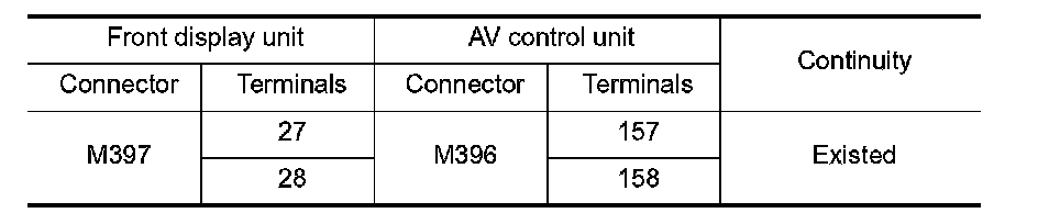 3. Check continuity between front display unit harness connector and AV control unit harness connector.