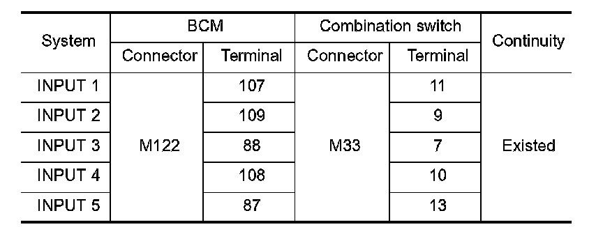 3. Check continuity between BCM harness connector and combination switch harness connector.
