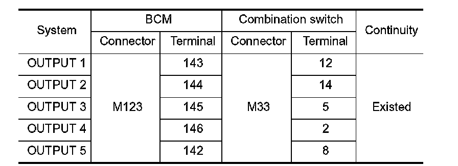 3. Check continuity between BCM harness connector and combination switch harness connector.