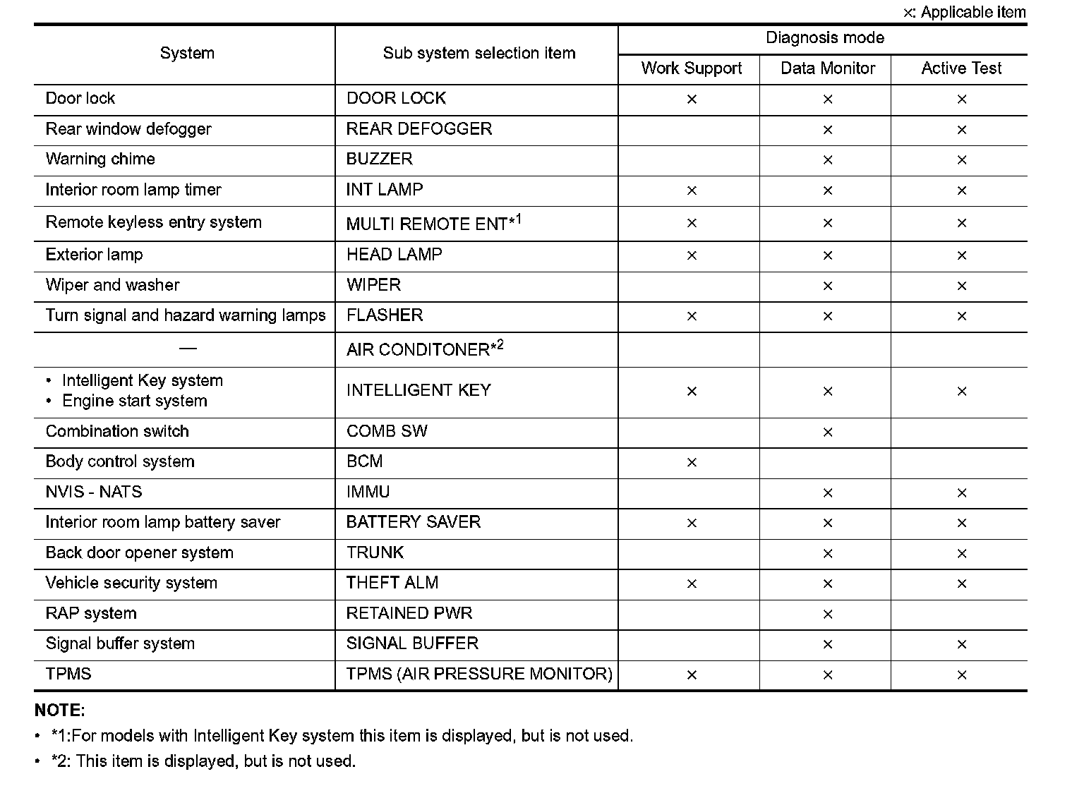 It can perform the diagnosis modes except the following items for all sub system selection items.
