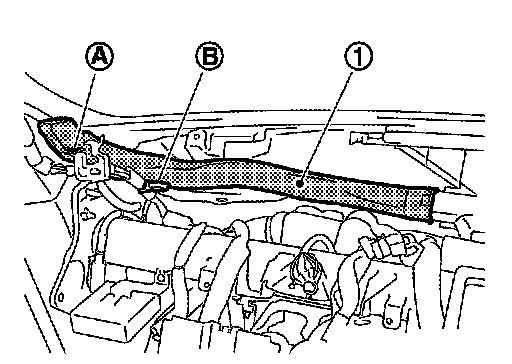 2. Remove mounting clip (A) and harness clip (B), and then remove side defroster nozzle (left) (1).