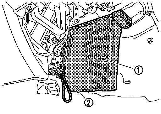 The intake sensor (2) is located on the evaporator. It converts air temperature after it passes through the evaporator (1) into a resistance value which is then input to the unified meter and A/C amp.