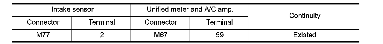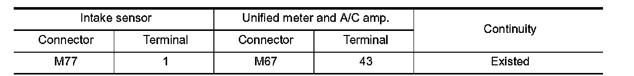 3. Check continuity between intake sensor harness connector and unified meter and A/C amp. harness connector.