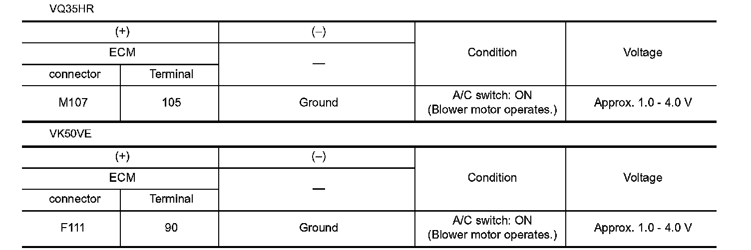 2. Check voltage of refrigerant pressure sensor in "Data monitor". (VQ35HR) or (VK50VE).