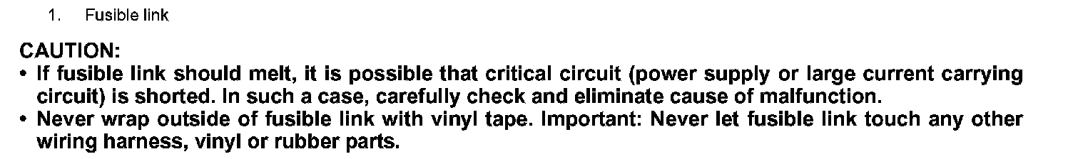 - If fusible link should melt, it is possible that critical circuit (power supply or large current carrying circuit) is shorted. In such a case, carefully check and eliminate cause of malfunction.