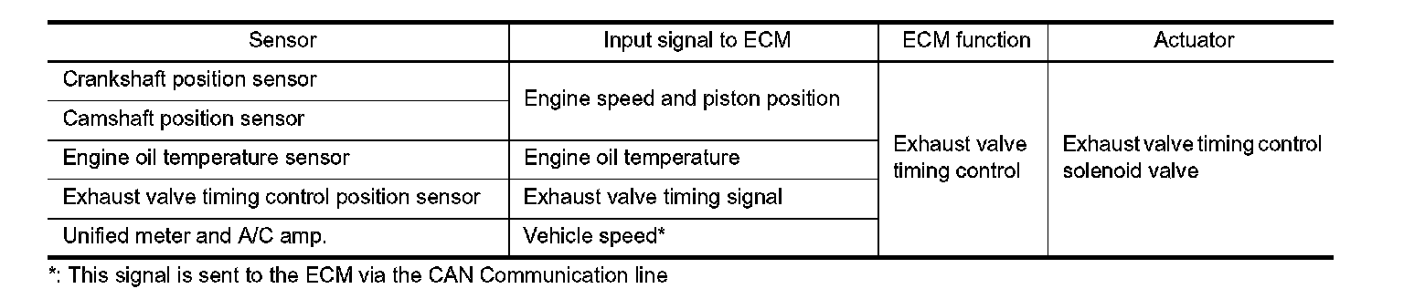 The ECM receives signals such as crankshaft position, camshaft position, engine speed, and engine oil temperature. Then, the ECM sends ON/OFF pulse duty signals to the exhaust valve timing control solenoid valve depending on driving status. This makes it possible to control the shut/open timing of the exhaust valve to increase engine torque and output in a range of high engine speed.