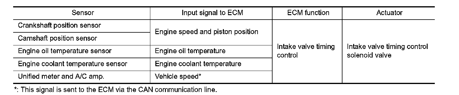 The ECM receives signals such as crankshaft position, camshaft position, engine speed, and engine coolant temperature. Then, the ECM sends ON/OFF pulse duty signals to the intake valve timing control solenoid valve depending on driving status. This makes it possible to control the shut/open timing of the intake valve to increase engine torque in low/mid speed range and output in high speed range.