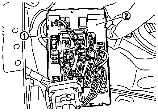 3. Remove fuel pump fuse (1) in IPDM E/R (2) to release fuel pressure.