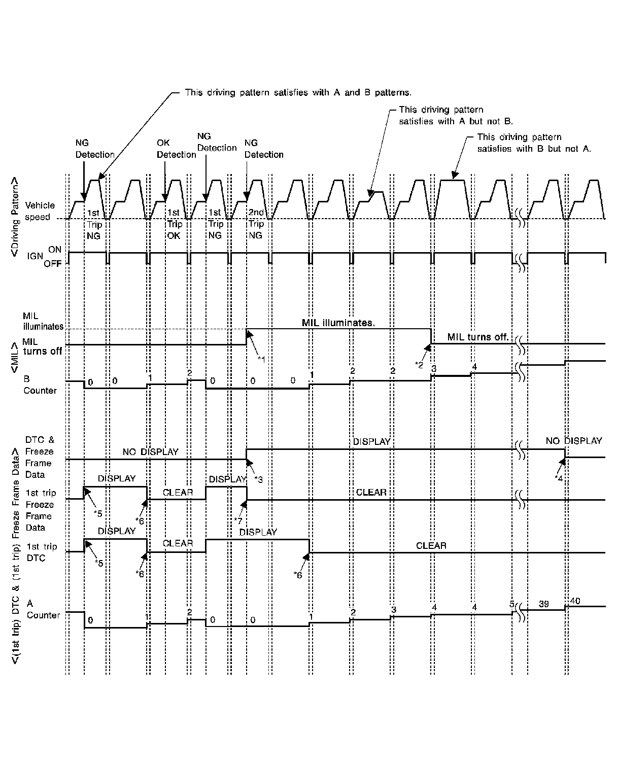 - The DTC and the freeze frame data will be stored until the vehicle is driven 40 times (driving pattern A) without the same malfunction recurring (except for Misfire and Fuel Injection System). For Misfire and Fuel Injection System, the DTC and freeze frame data will be stored until the vehicle is driven 80 times (driving pattern