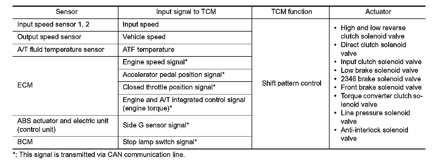 TCM receives the side G sensor signal from the ABS actuator and electric unit (control unit). It locks to 4GR, 5GR or 6GR position in moderate cornering or to 3GR position in sharp cornering based on this signal. This prevents any upshift and kickdown during cornering, maintaining smooth vehicle travel.
