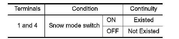 3. Check the continuity between snow mode switch terminals under the following conditions.