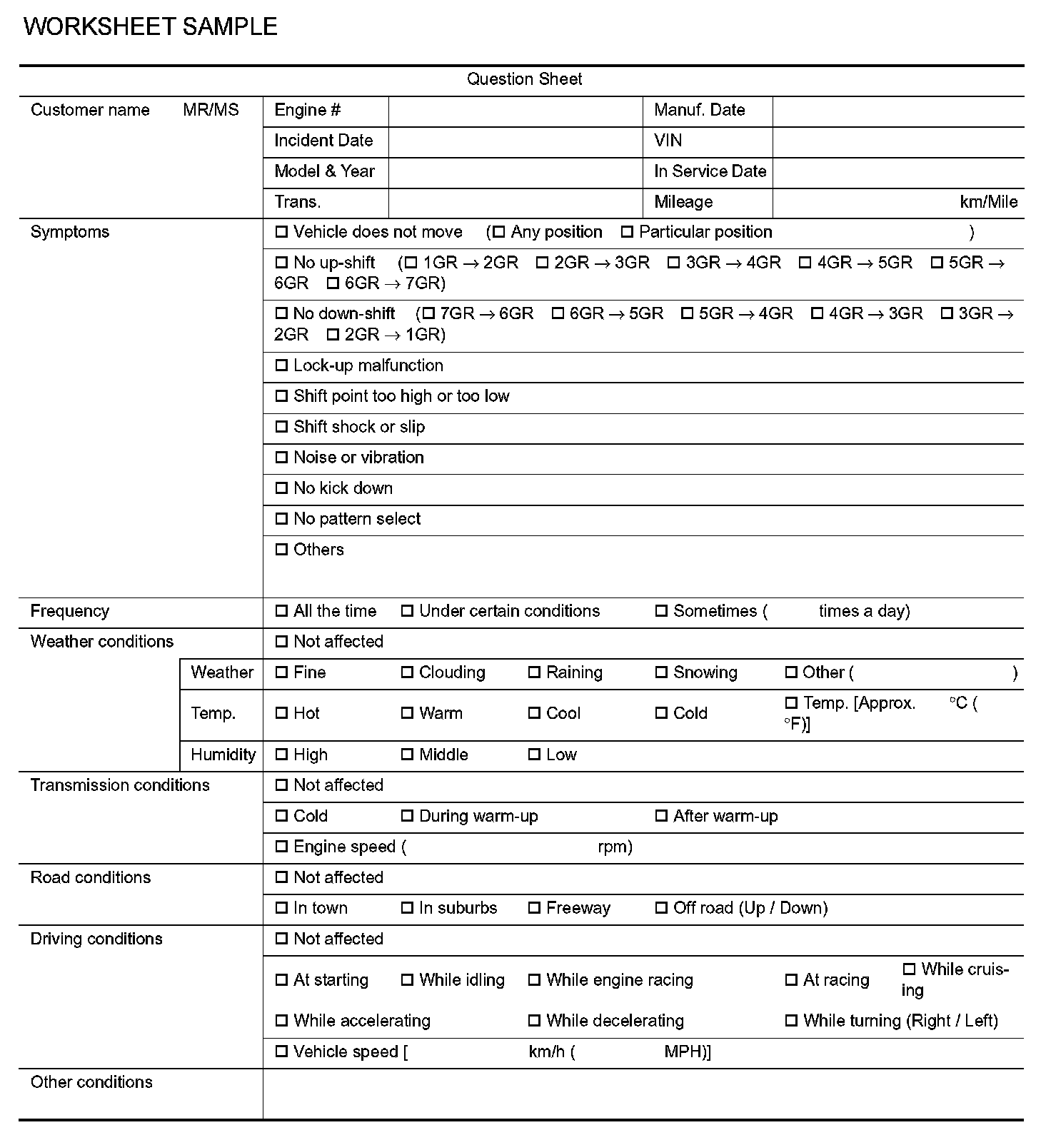 There are many operating conditions that may cause a malfunction of the transmission parts. By understanding those conditions properly, a quick and exact diagnosis can be achieved.